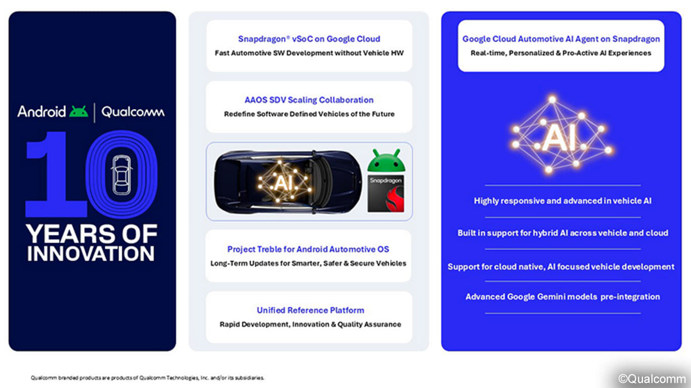 Les deux entreprises souhaitent accélérer le développement des véhicules définis par logiciel en combinant la puissance des puces Snapdragon avec l’IA de Google, notamment Gemini. L’objectif est de faire fonctionner de concert des modèles d’IA embarqués et des modèles hébergés dans le cloud, afin d’offrir des expériences plus personnalisées.